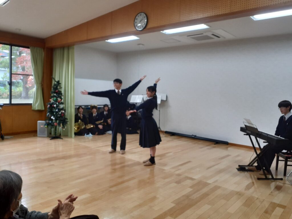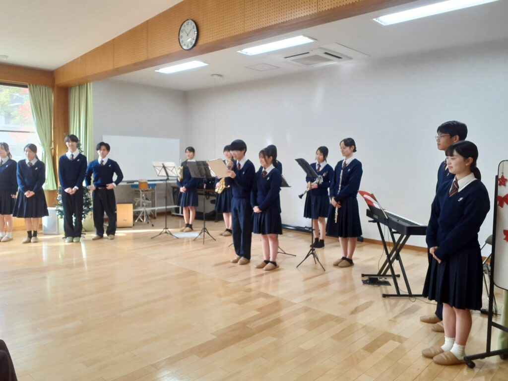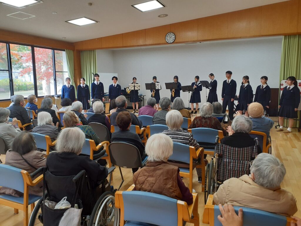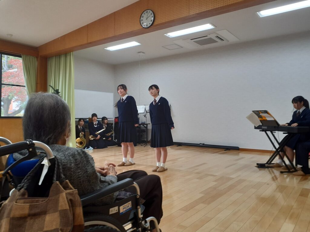 地域交流の一環として、必由館の生徒さんたちが演奏ボランティアに来てくれました!デイサービスのご利用者さんに楽しんでいただきたいいう思いのつまった演奏は、どれも工夫されており、胸に響く生の演奏、生徒さんのエネルギッシュな歌声に感動いたしました!!
