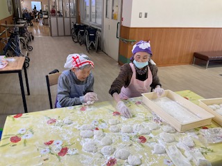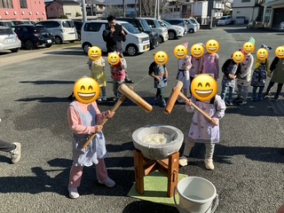 12月19日は近隣住民の皆様にもお手伝いいただき、友愛会保育園の園児さんたちも来所してくれました!笑顔と元気な声に包まれ活気あふれる餅つき大会になりました。
