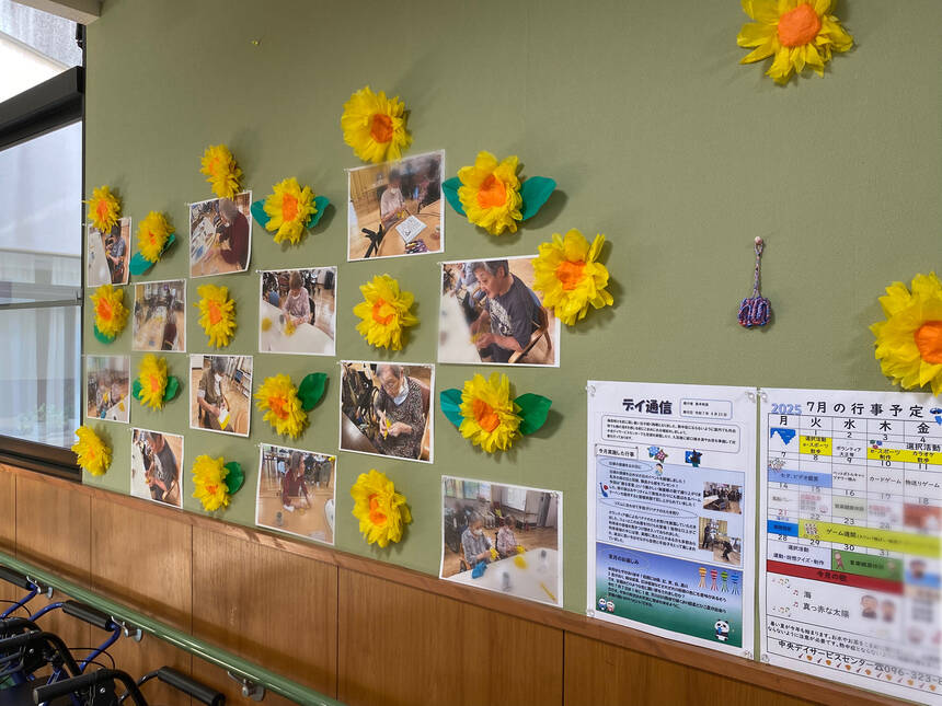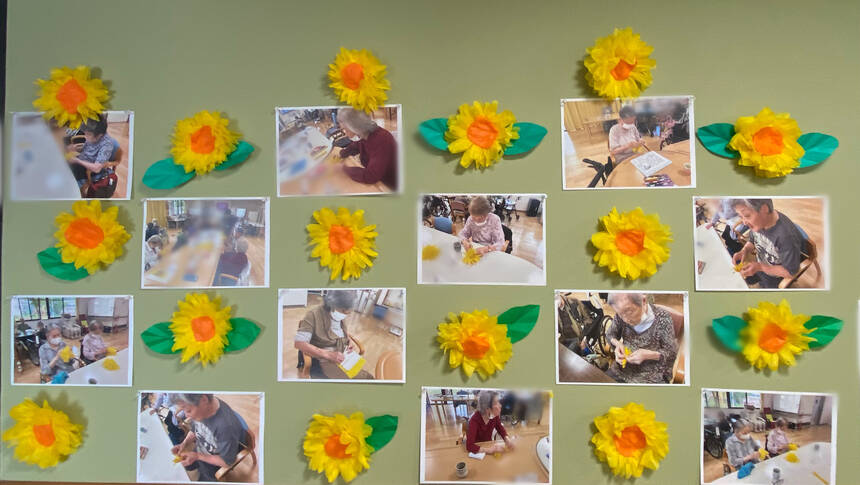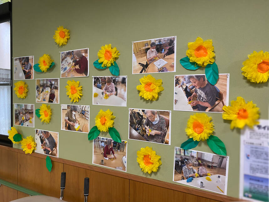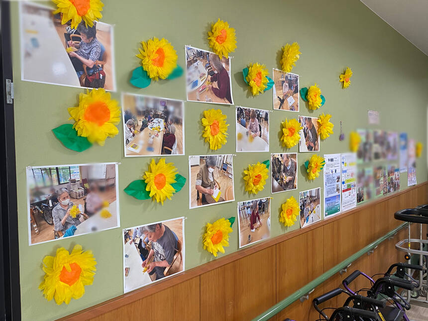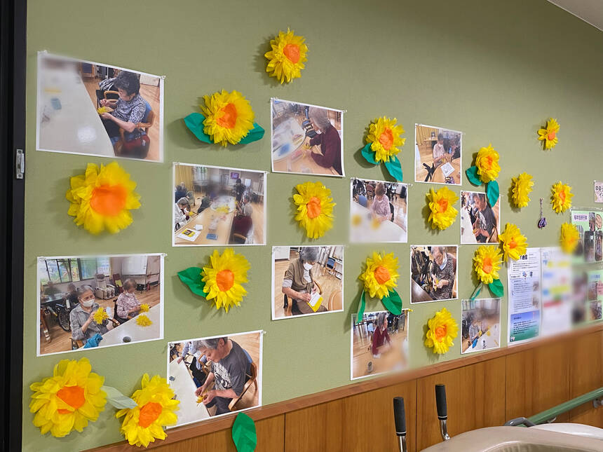玄関ホールからデイルームに繋がる壁面には、気分を明るくするひまわりの鮮やかな黄色が目に入り視覚でも癒やしてくれます☆