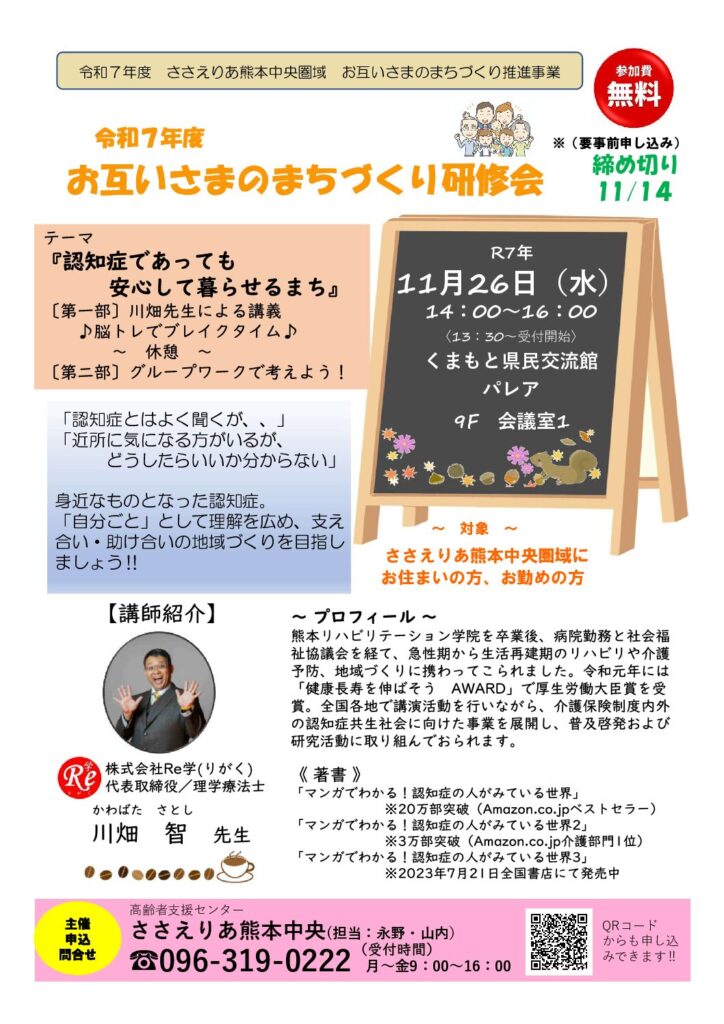 令和7年11月26日(水)14:00~16:00 ※13:30受付開始 くまもと県民交流館パレア9階 会議室1にて『おたがいさまのまちづくり研修会』を開催いたします。