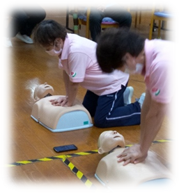 人形を使った胸骨圧迫の訓練や蘇生ガイドラインに沿った救命の手順と AEDの取り扱いについて職員一同真剣な面持ちで研修を受けました。