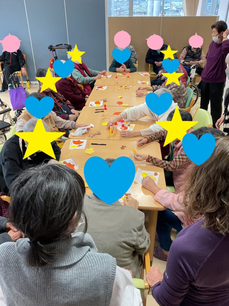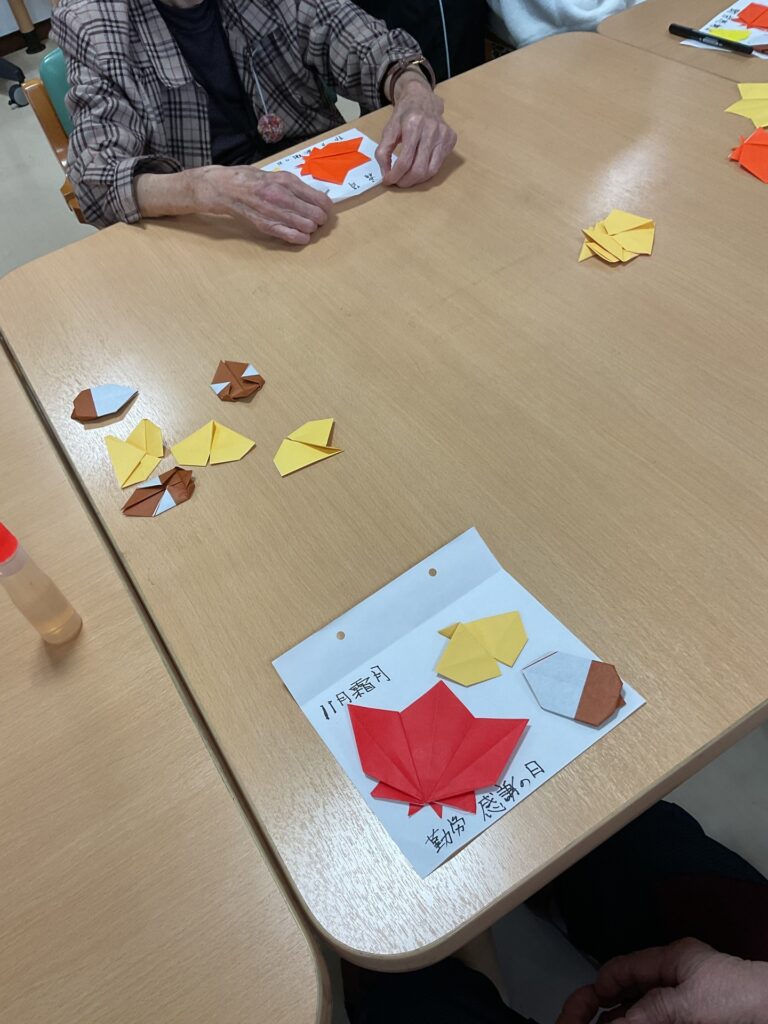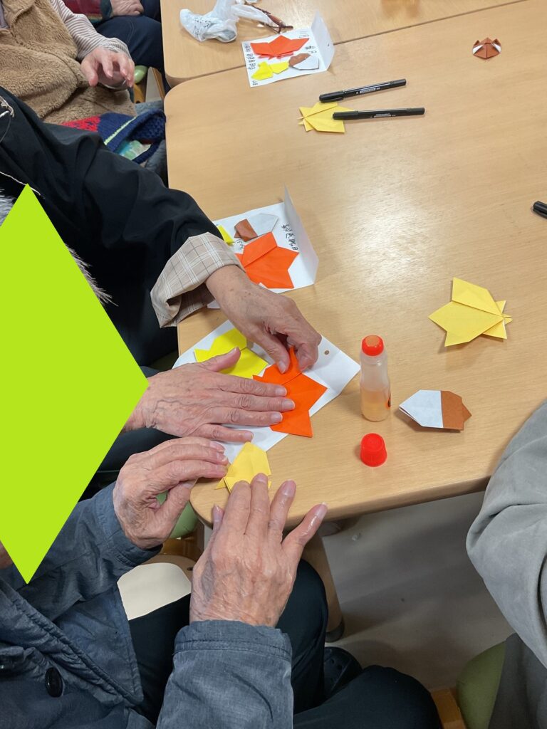 2025.11.19 おりがみ教室 ~11月🍂~ #明生園 恒例の折り紙教室を開催しました。今回は11月を表現するに相応しい「落ち葉🍂」を折られています。折り紙で作ったイチョウやモミジ、ドングリなどを集め、それぞれの『ちいさい秋』にして飾られるようですね。 折り紙教室は女性入居者に人気がありますが、男性入居者も参加されたり、また参加せずとも「何か楽しそうにしよるばいね?」と気になって眺めている方も多いようです。 手慣れた入居者はボランティア講師と一緒に折り方を教えられたり、皆さんで楽しめる雰囲気作りを心掛けられています。 お知らせ一覧 前の記事へ 次の記事へ ページ送り