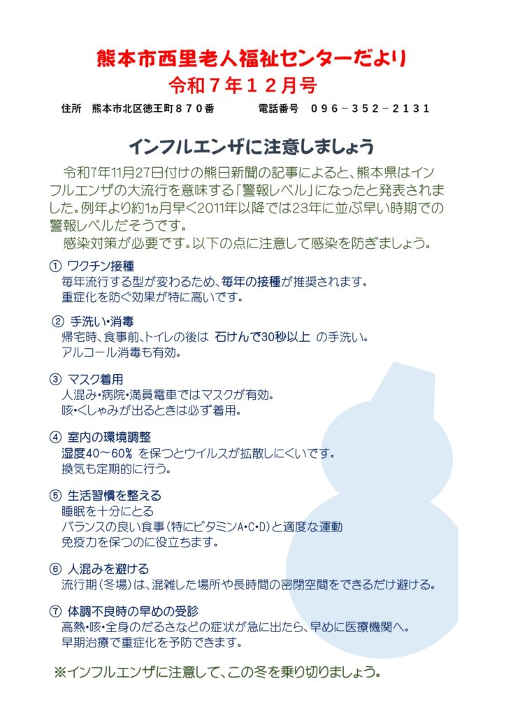 2025.12.09 インフルエンザに注意しましょう #西里老人福祉センター 西里老人福祉センターは、現在休館中です。令和8年1月15日までの予定です。 お知らせ一覧 前の記事へ 次の記事へ ページ送り