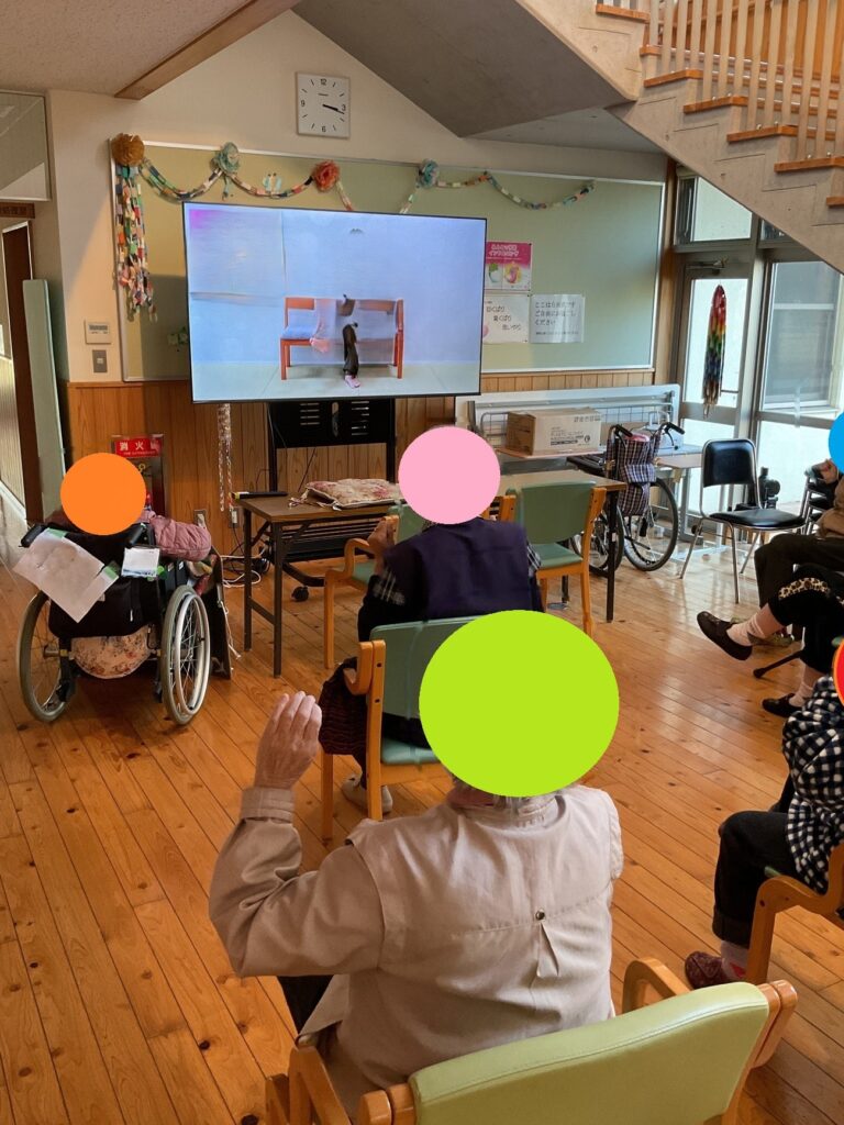 これまでにも日中のレクリエーション活動を紹介させていただきました。職員が工夫し、入居者様に楽しみながら健康活動に取り組んでもらってきました。しかし体操などの視覚から情報を多く入れるもの(皆さん高齢になるにつれて聞こえづらくなられています)には、これまでのレク活動に参加される皆さんに見える大きさではありませんでした。