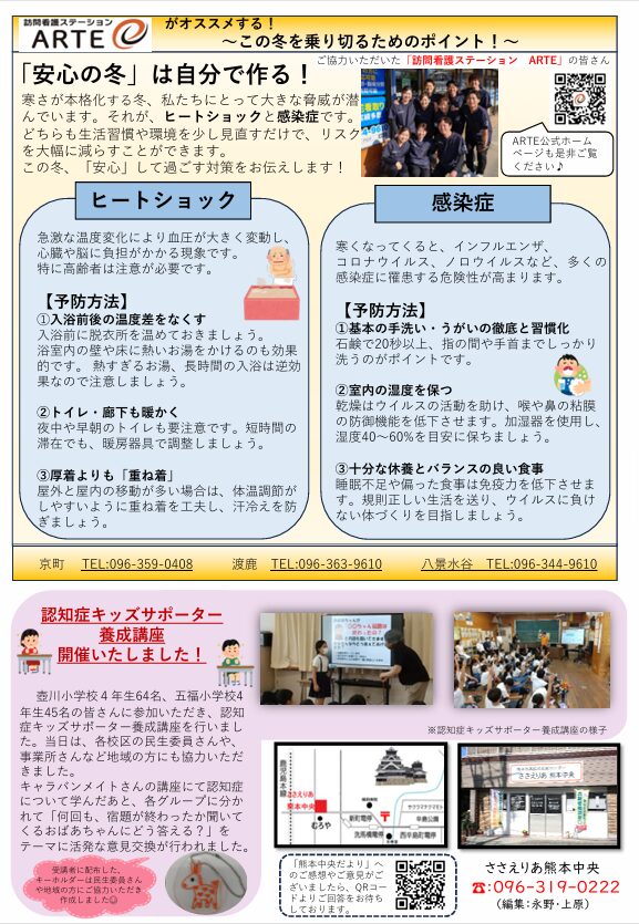 11月26日に開催いたしました「お互いさまのまちづくり研修会」の様子や、お元気高齢者の紹介。 訪問看護ステーションARTE(アルテ)さんにご協力いただき「冬を乗り切るためのポイント」として、ヒートショックと感染症について、予防方法をわかりやすくご紹介していただいています。 「わたしの町の、お元気高齢者♪」のコーナーでは、今回は城東校区にお住まいの柳井様にご協力していただき、各地を飛び回り、現役で続けられている古美術店のお話などを紹介しています✈ 次回は、慶徳校区のお元気高齢者を紹介予定です☺