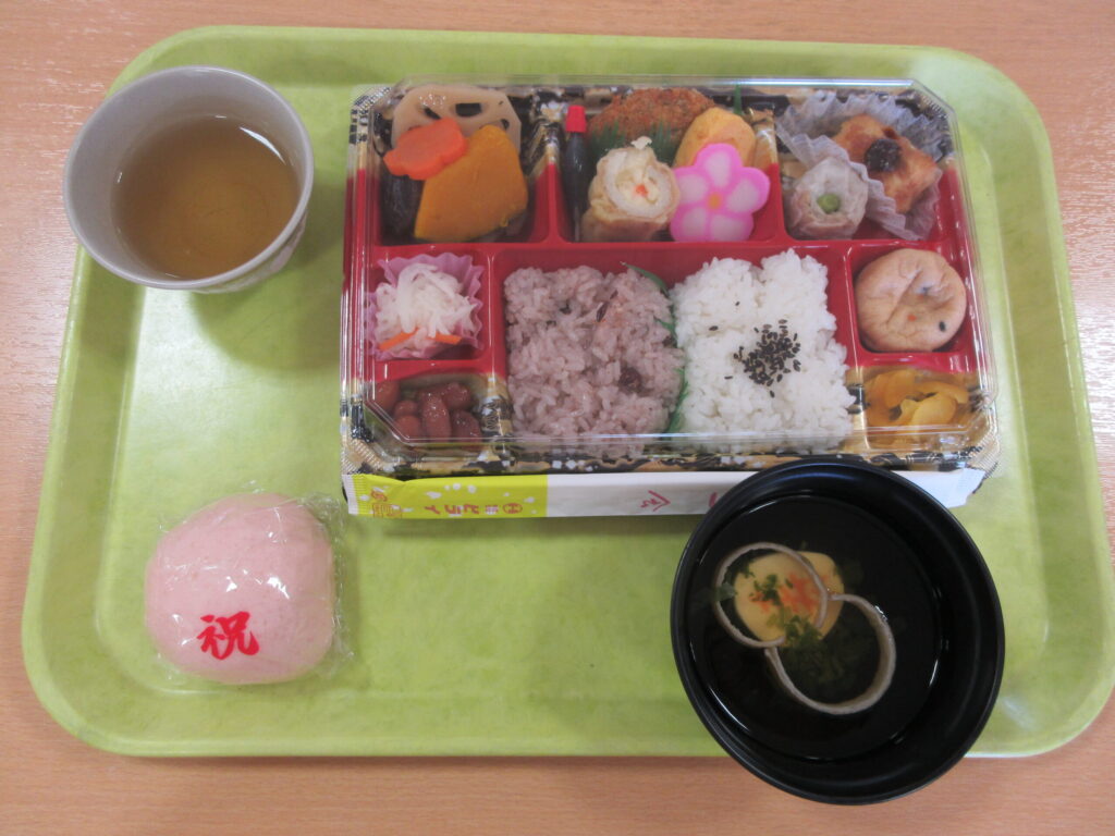 祝賀式、公演が終わるとお祝いの食事が提供されました。お弁当形式の祝い膳とお祝い饅頭が出てきました。いつもの食事(もちろん美味しくて栄養バランスの良い食事ですよ笑)と異なるものでしたので、自然と周りとの会話も弾んでいる様子でした。