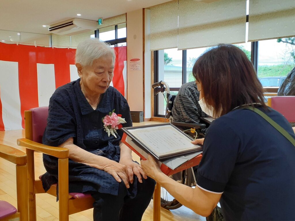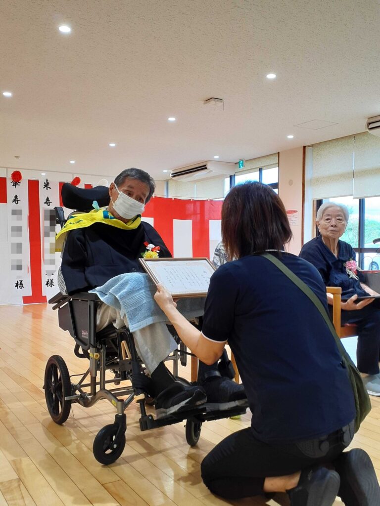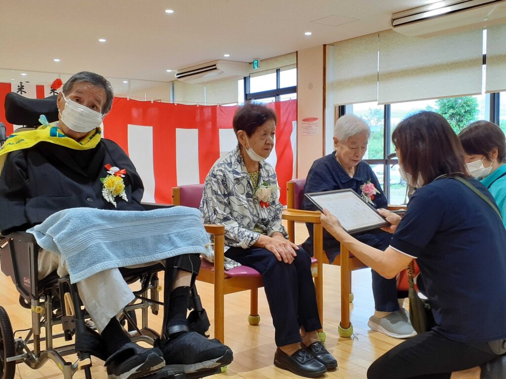 長寿の里デイサービスセンター敬老会2日目の9月10日(水)、本日は傘寿1名、米寿2名、卒寿1名、計4名の方のお祝いをしました。